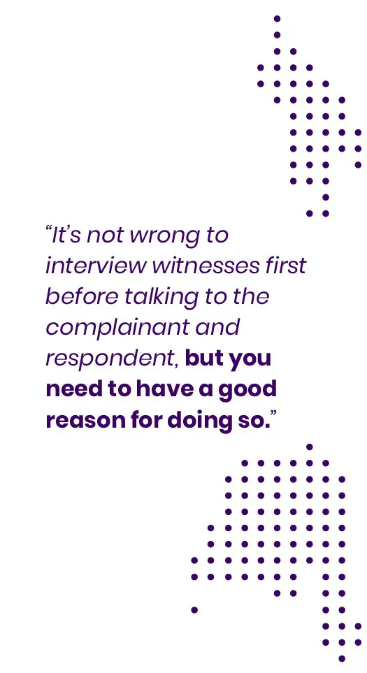 Interviewing witnesses before meeting with the respondent may be necessary in the interest of commencing a timely investigation, says Lowes – for example, if the respondent is not immediately available (or willing) to be interviewed.