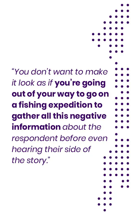 But the investigator must proceed carefully in these circumstances, says Bird. “You don’t want to make it look as if you’re going out of your way to go on a fishing expedition to gather all this negative information about the respondent before even hearing their side of the story.”