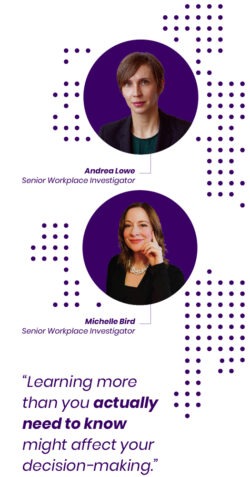 “Many investigators when they’re starting out take the shotgun approach and try to get as much information as possible,” says Michelle Bird, Senior Workplace Investigator at Certitude Workplace Investigations. “But that’s not actually a neutral approach, because the more people you interview, the more people know about investigation and the less confidentiality you have.”